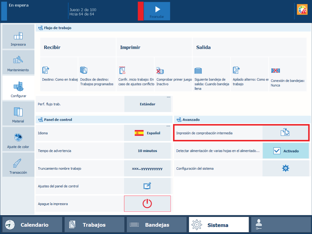 [Cuando está habilitado]: restablecer cuando el ajuste [Intervalo de impresión de comprobación intermedia] esté configurado como activo.