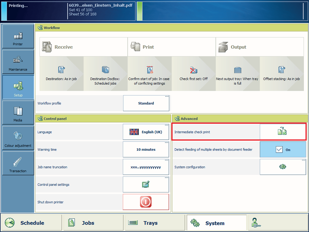 Une vérification intermédiaire de l'impression consiste en l'impression d'un exemple de feuille de travail. Vous pouvez utiliser ces feuilles pour vérifier la qualité de l’impression. Les impressions test intermédiaires sont imprimées selon un intervalle défini, mais peuvent aussi être imprimées sur demande.