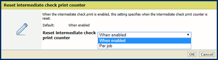 [Lorsque cette option est activée] : réinitialiser lorsque le paramètre [Intervalle de la vérification intermédiaire de l'impression] est défini sur activé.