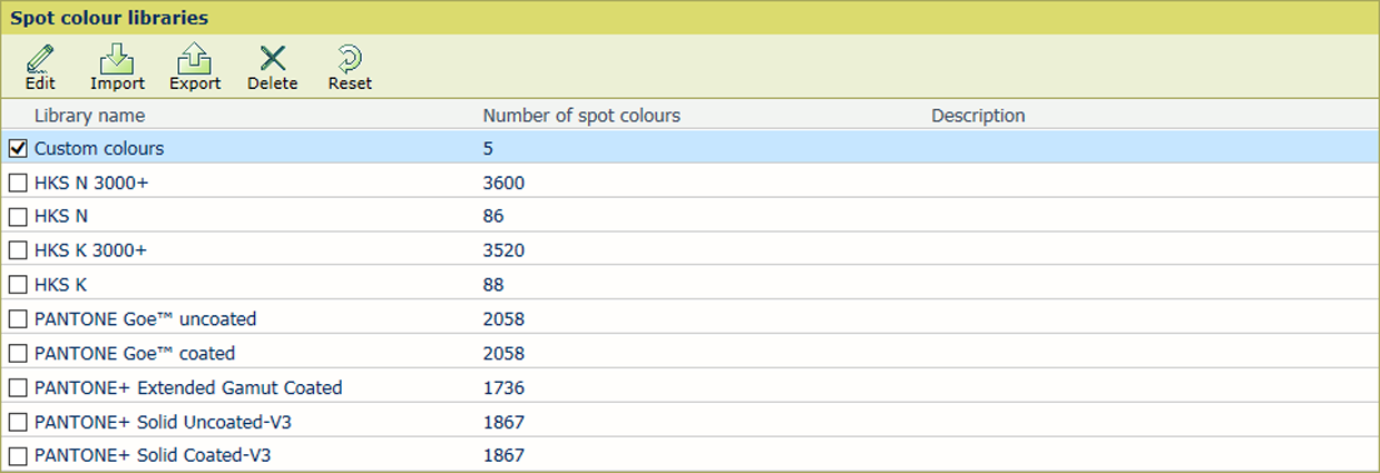 Biblioteki kolorów spotowych w programie Settings EditorMożna edytować tylko uprzednio zaimportowane biblioteki kolorów spotowych (nazwanych profili kolorów).