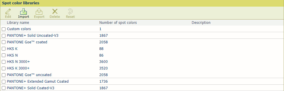 カスタムスポットカラーライブラリを選択すると、[リセット] オプションによってカスタムスポットカラー定義が削除されます。