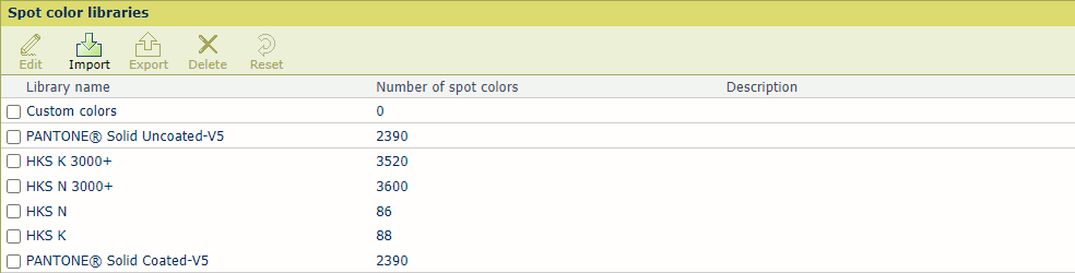 When you select a custom spot color library, the [Reset] option deletes all custom spot color definitions.