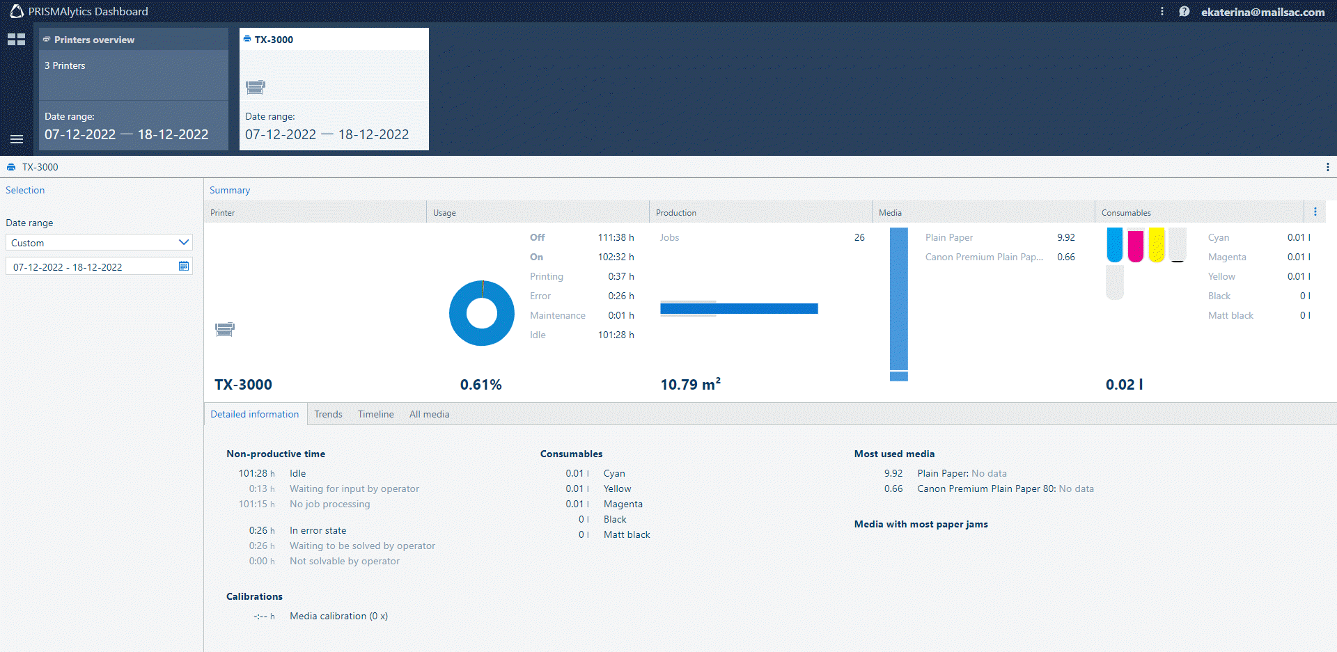 A(z) [Nyomtató] alkalmazással részletesebb információkat jeleníthet meg egy adott nyomtatóról. A(z) [Nyomtató] alkalmazás megnyitásához kattintson egy adott nyomtatóra a(z) [Nyomtatók áttekintése] alkalmazásban. Ezzel megnyílik egy nyomtatókártya is, amelyen a nyomtató neve és a kiválasztott intervallum látható.