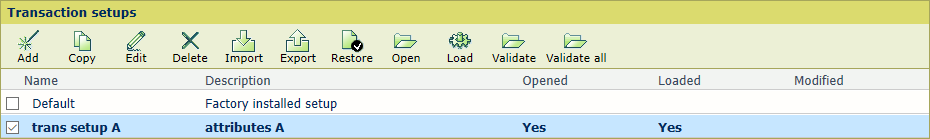 • You want to apply the changes of an active (loaded) transaction setup. You can read the status of the [Modified] column to see if a transaction setup must be loaded again.