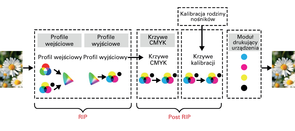 Dokument i wynik zarządzania kolorami przez procesor RIP określają odwzorowanie kolorów. Po zakończeniu procesu zarządzania kolorami przez procesor RIP stosowane są krzywe kalibracji.