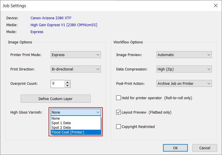 Αυτή η ενότητα σας δείχνει πώς να ρυθμίσετε μια εργασία εκτύπωσης με βερνίκι. Μπορείτε να εκτυπώσετε μια απλή εργασία (Flood Coat Fill) χωρίς προετοιμασία δεδομένων ή πιο σύνθετες εργασίες με χρήση δεδομένων Spot που πρέπει να υπάρχουν στην εργασία εκτύπωσης. Για περισσότερες πληροφορίες, ανατρέξτε στην ενότητα Επισκόπηση ροής εργασιών βερνικιού.
