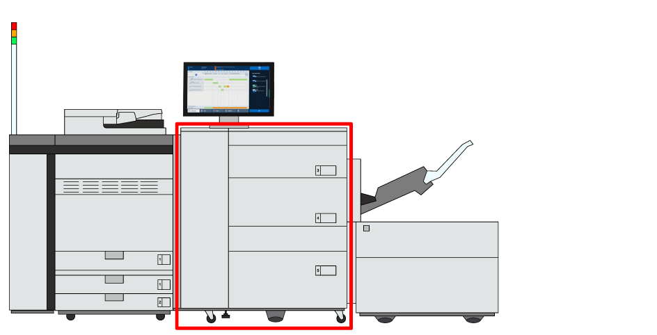 The paper module increases the input capacity of the print system. The upper and middle paper trays can hold up to 1500 sheets, 80 g/m² (22 lb bond); the lower deck can hold up to 2000 sheets, 80 g/m² (22 lb bond). The paper trays feed the media face up.