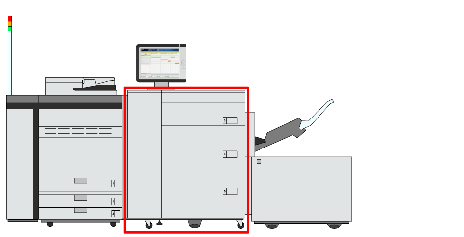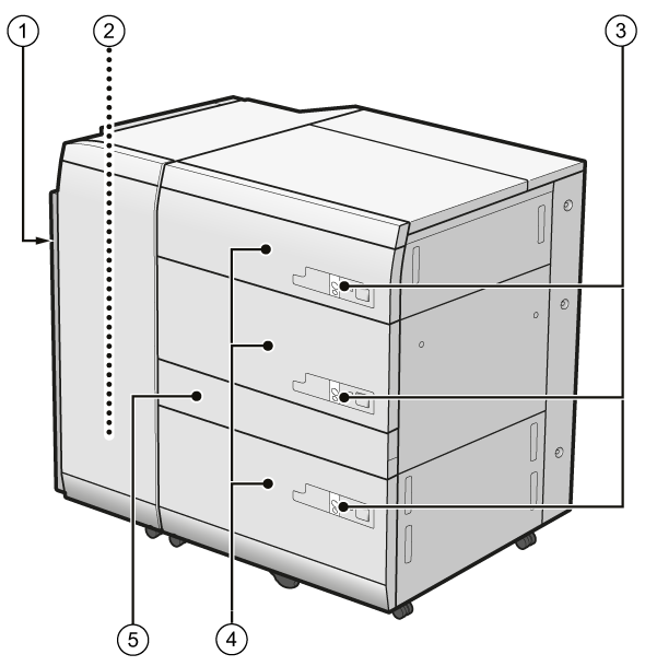 The paper module increases the input capacity of the print system. The upper and middle paper trays can hold up to 1500 sheets, 80 g/m² (22 lb bond); the lower deck can hold up to 2000 sheets, 80 g/m² (22 lb bond). The paper trays feed the media face up.