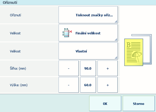Aby bylo možné přizpůsobit koncovou velikost produktu, musíte definovat nastavení ořezávání. Pokud nevyberete [Tisknout značky oříznutí], nemusíte být schopni definovat potřebné vyřazení.