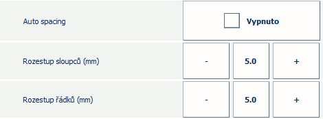 Jestli nechcete, aby program PRISMAsync automaticky počítal řádkování sloupců a řádků, zakažte [Automatické mezery]. Definujte [Rozestup sloupců (mm)] a [Rozestup řádků (mm)] ručně, například 5 mm.