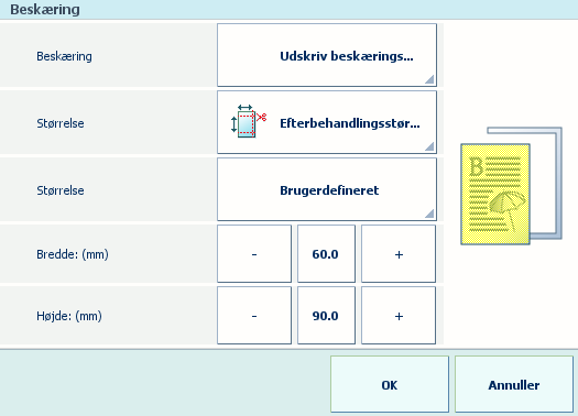 Du skal definere beskæringsindstillingerne for at kunne tilpasse den endelige størrelse af dit produkt. Hvis du ikke vælger [Udskriv beskæringsmærker], kan du ikke definere den nødvendige udskydning.