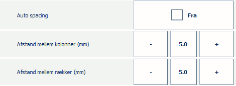 Hvis du ikkeønsker, at PRISMAsync automatisk skal beregne kolonne- og rækkeafstand, skal du deaktivere [Automatisk afstand]. Definer [Afstand mellem kolonner (mm)] og [Afstand mellem rækker (mm)] manuelt, f.eks. 5 mm.