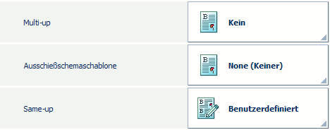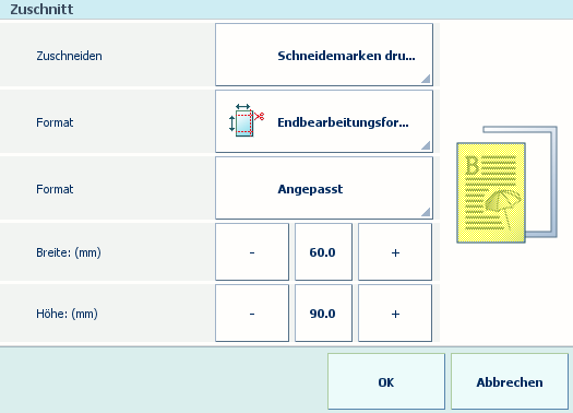 Sie müssen die Zuschnitteinstellungen definieren, um das Endformat Ihres Produkts anpassen zu können. Wenn Sie nicht [Schneidemarken drucken] auswählen, können Sie nicht das benötigte Ausschießschema festlegen.