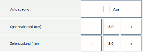 Wenn Sie nicht wollen, dass PRISMAsync den Zeilen- und Spaltenabstand automatisch berechnet, deaktivieren Sie [Auto spacing (Automatischer Abstand)]. Legen Sie[Spaltenabstand (mm)] und [Zeilenabstand (mm)] manuell fest, beispielsweise auf 5 mm.