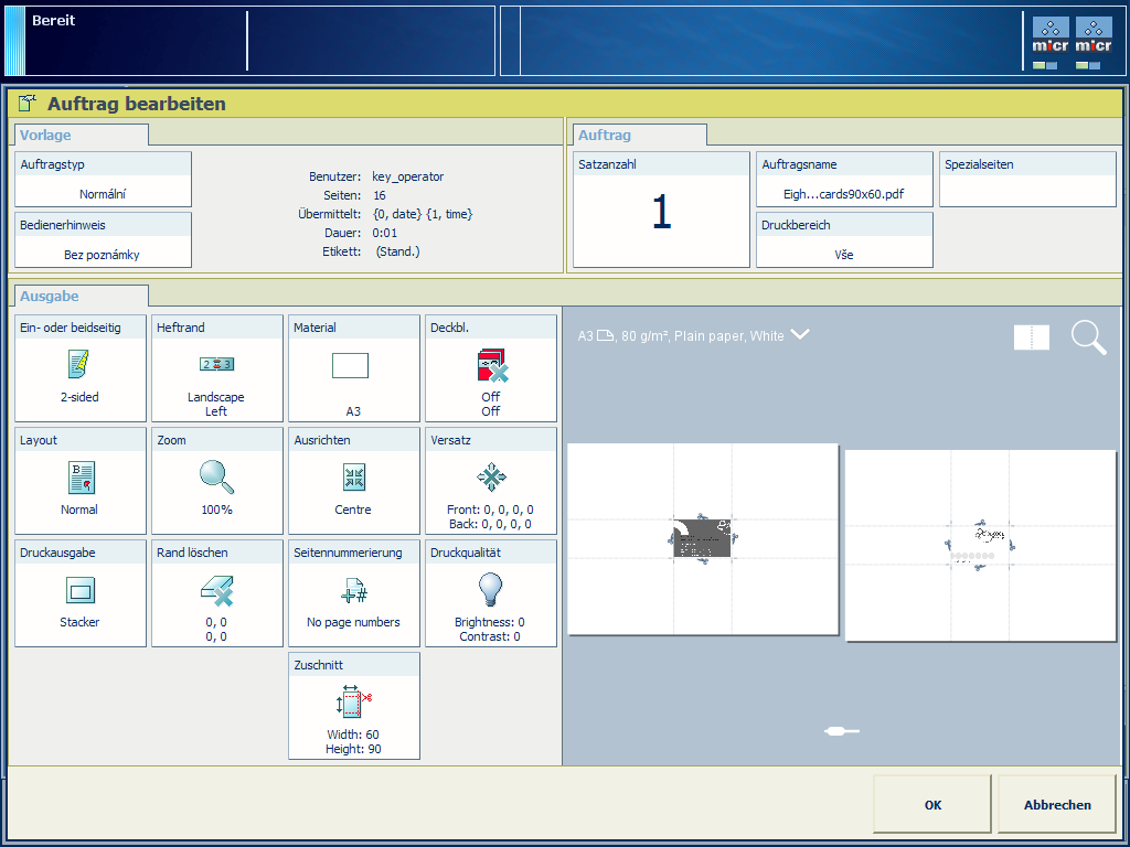 Dieses Verfahren zeigt ein Beispiel für das Ausschießschema von Visitenkarten. Visitenkarten werden auf einem beidseitigen Bogen gedruckt. Nach dem Zuschneiden werden verschiedene Stapel erstellt. Am Ende enthält jeder Stapel dieselbe Anzahl von Visitenkarten.