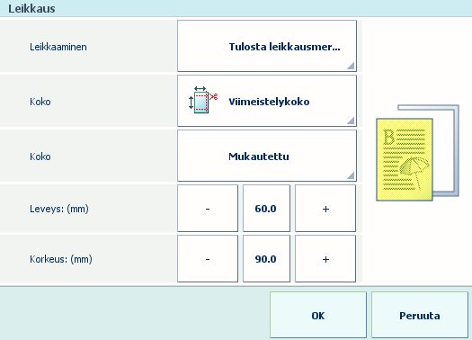 Sinun on määritettävä leikkausasetukset, jotta voit mukauttaa valmiin tuotteen kokoa. Jos et valitse [Tulosta leikkausmerkit] -asetusta, et voi valita tarvittavaa asemointia.