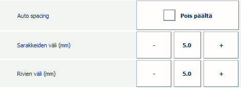 Jos et halua, että PRISMAsync laskee sarakkeiden ja rivien välin automaattisesti, poista [Automaattinen väli] ‑asetus käytöstä. Määritä [Sarakkeiden väli (mm)] ja [Rivien väli (mm)] manuaalisesti, esimerkiksi 5 mm.