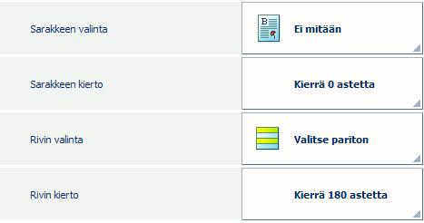 Voit myös valita, kääntää ja kiertää rivejä ja/tai sarakkeita. Nämä asetteluasetukset voivat olla hyödyllisiä esimerkiksi silloin, kun käyntikorttien toisella puolella käytetään samaa kuviota. Kuvioltaan samanlaisten puolien sijoittaminen vierekkäin tekee rajaamisesta vähemmän epätarkkaa.