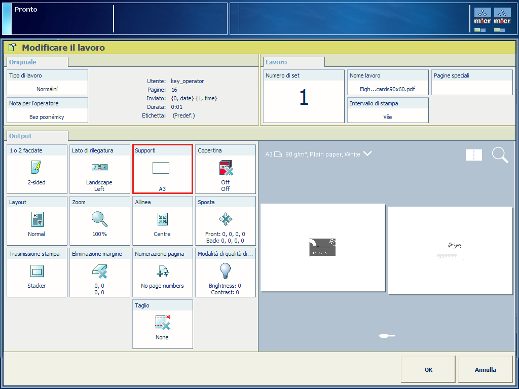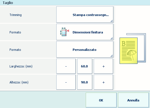 Per poter personalizzare le dimensioni finali del prodotto è necessario definire le impostazioni di rifilatura. Se non si seleziona [Stampa contrassegni ritaglio], non sarà possibile definire l'imposizione richieste.