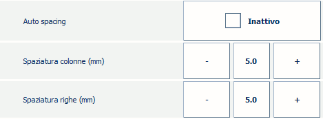 Se non si desidera che PRISMAsync calcoli automaticamente la spaziatura colonne e righe, disattivare [Spaziatura automatica]. Definire [Spaziatura colonne (mm)] e [Spaziatura righe (mm)] manualmente, ad esempio, 5 mm.