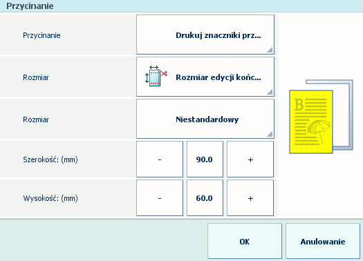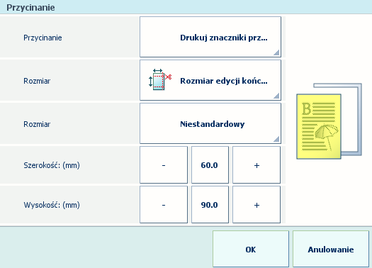 Musisz określić ustawienia przycinania, aby móc dostosować rozmiar końcowy produktu. Jeśli nie wybierzesz [Drukuj znaczniki przycinania], zdefiniowanie potrzebnej impozycji nie będzie możliwe.