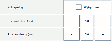 Jeśli nie chcesz, aby PRISMAsync automatycznie obliczał odstępy między kolumnami i wierszami, wyłącz [Automatyczne odstępy]. Określ [Rozstaw kolumn (mm)] i [Rozstaw wierszy (mm)] ręcznie, na przykład: 5 mm.