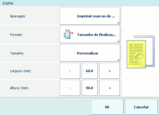 É-lhe exigido que defina as definições de corte para poder personalizar o tamanho final do produto. Se não selecionar [Imprimir marcas de corte], não poderá definir a imposição necessária.
