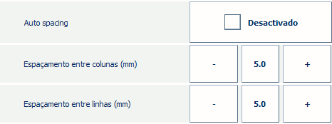 Se não quiser que o PRISMAsync calcule automaticamente o espaçamento de colunas e linhas, desative [Espaçamento automático]. Defina[Espaçamento entre colunas (mm)] e [Espaçamento entre linhas (mm)] manualmente, por exemplo, 5 mm.