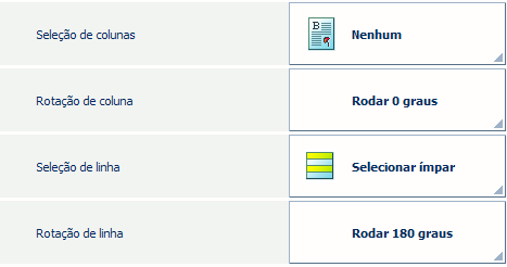 Também é possível selecionar, virar e rodar linhas e/ou colunas. Por exemplo, estas definições de disposição podem ser úteis quando um dos lados dos cartões de visita tem o mesmo padrão. Colocar os lados com o mesmo padrão ao lado um do outro torna o corte menos propenso à imprecisão.
