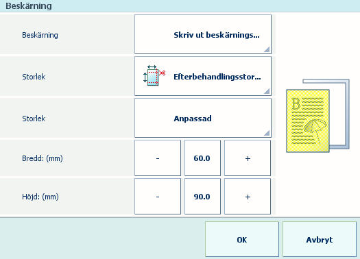 Du måste definiera beskärningsinställningarna för att anpassa produktens slutstorlek. Om du inte väljer [Skriv ut beskärningsmark.] går det inte att definiera den nödvändiga utskjutningen.