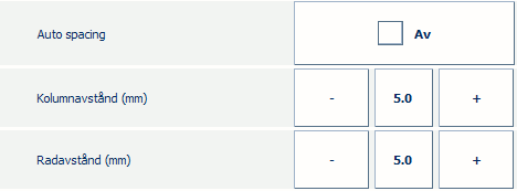 Om du inte vill att PRISMAsync beräknar kolumn- och radavstånd automatiskt måste du inaktivera [Automatiskt avstånd]. Definiera [Kolumnavstånd (mm)] och [Radavstånd (mm)] manuellt, exempelvis 5 mm.