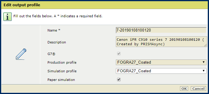 • [Papiersimulatie]: hier wordt aangegeven of papiersimulatie wordt gebruikt voor een samengesteld uitvoerprofiel.