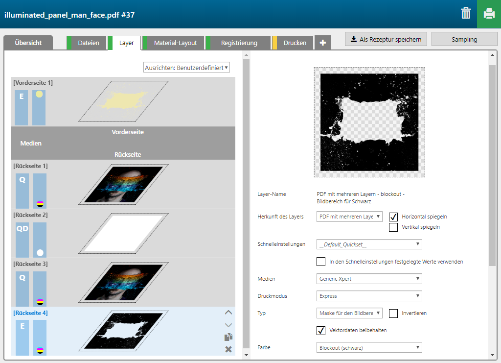 Die Rezeptur 'Illuminated panel' enthält 5 Layer, von denen 1 auf die Vorderseite des Materials gedruckt wird und 4 auf die Rückseite.
