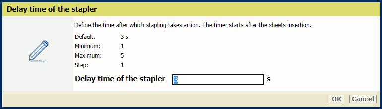 Użyj ustawień [Opóźnienie zszywacza], aby wybrać czas, po jakim nastąpi zszywanie od momentu ręcznego włożenia arkuszy do szczeliny zszywania.