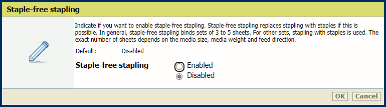 Po włączeniu zszywania bezszywkowego następuje ocena specyfikacji zadania w celu określenia, czy opcja ze zszywkami może zostać zastąpiona przez bezzszywkową alternatywę (zaciskanie i oprawianie arkuszy). Zszywanie bez zszywek jest stosowane w przypadku zadań obejmujących 3–5 arkuszy. Dokładna liczba arkuszy zależy od rozmiaru i gramatury nośnika oraz kierunku podawania.