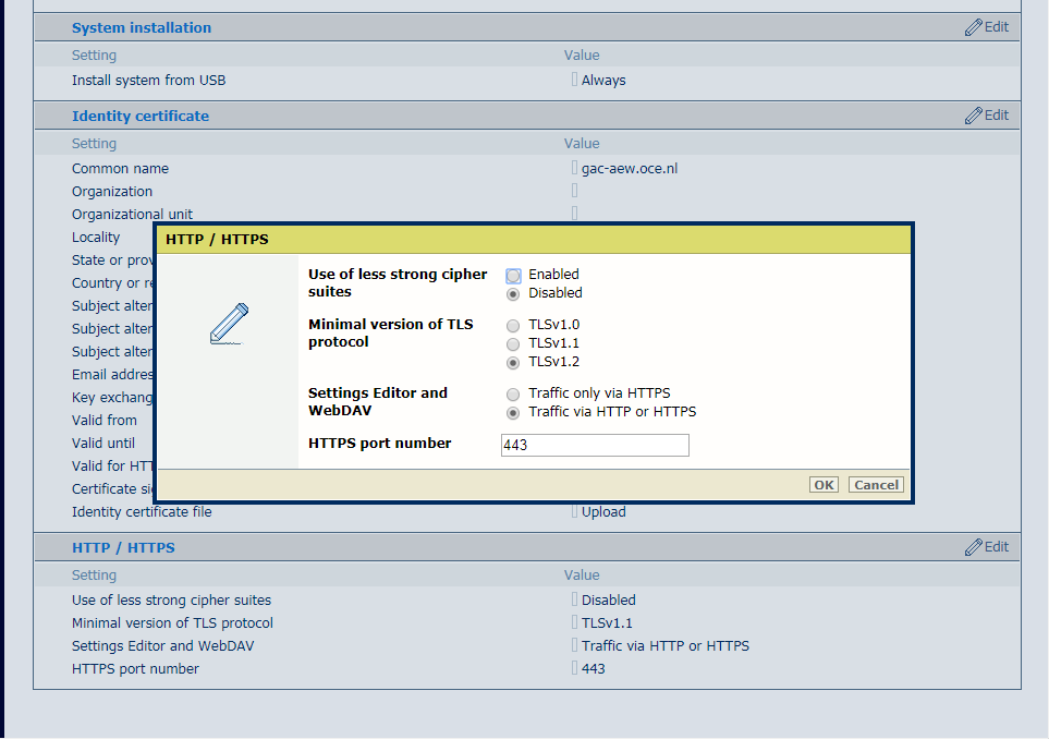 Nastavení [Minimální verze protokolu TLS] je ve výchozím nastavení nastaveno na [TLSv1.2]. [TLSv1.2] je silnější protokol a [TLSv1.0] je slabší. Nastavení můžete změnit na minimální bezpečnostní protokol, který odpovídá vašim bezpečnostním požadavkům. Je také možné použít nižší protokol umožňující komunikaci se staršími prohlížeči nebo klienty HTTPS.