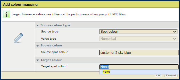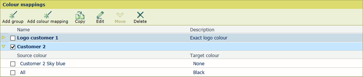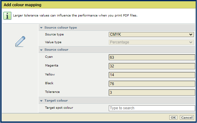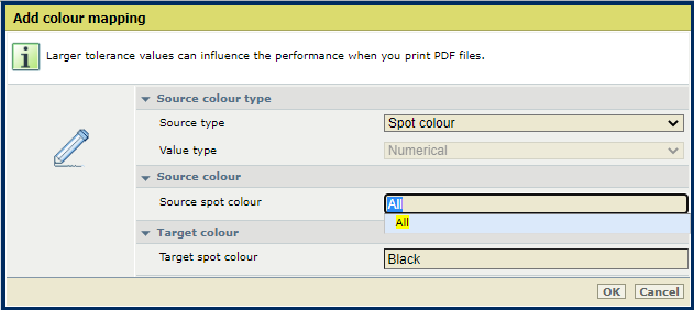 Таблица цветов — это элемент, который сопоставляет (преобразует) значение исходного цвета с новыми значениями целевого цвета. Таблица цветов применяется во время RIP-обработки задания. Таблица цветов также применяется к панелям цвета и информационным панелям.