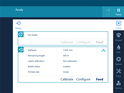 Se o material que utilizar necessitar de uma faixa de entrada de material rígido, então é necessário verificar a definição [Requires Manual Loading] no software [Media Characteristics] section of the RIP. Com esta definição, a leitura é realizada imediatamente antes da impressão.