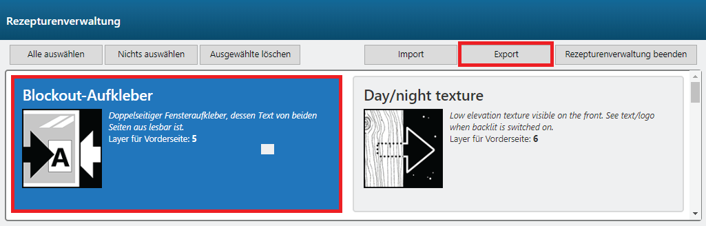 2. Klicken Sie auf die gewünschte Rezeptur und dann auf die Schaltfläche [Export].