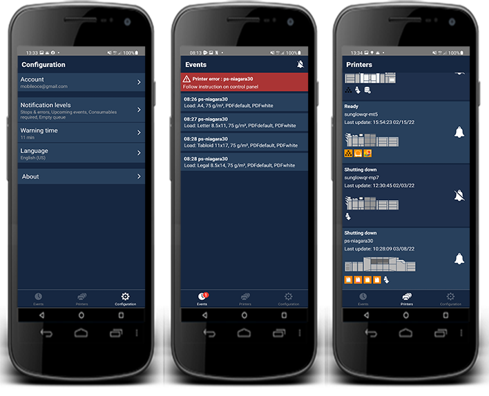 You receive alerts when actions, such as loading media or adding consumables, are foreseen. Or, in case a problem at the printer asks for an immediate action.