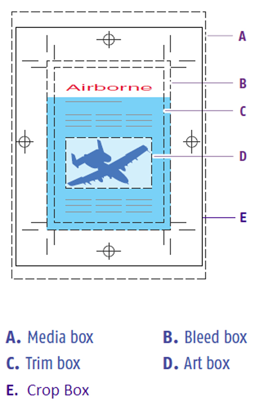 Hvis heller ikke beskjæringsboksen er definert, får tilskjærings-, utfalls- og beskjæringsboksen samme størrelse som medieboksen. Medieboksen er alltid definert for en PDF-side.