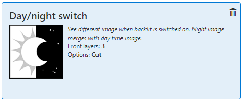 Mit der Rezeptur [Tag/Nacht-Umschaltung] können Sie ein Anwendungsdesign erstellen, das zwei unterschiedliche Bilder zeigt: eines für den Tag und ein anderes, wenn die Hinterleuchtung eingeschaltet ist.