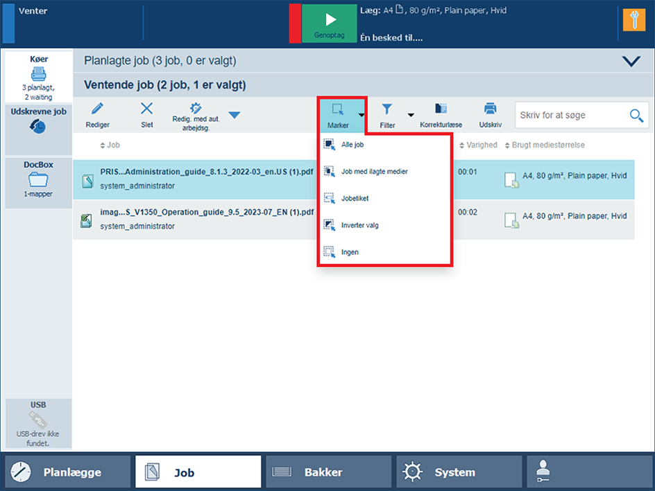 Tryk på eller for at gå til listen over ventende job eller listen over planlagte job.