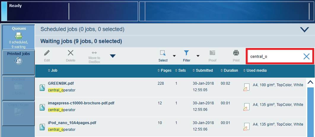 Tiskárna PRISMAsync Print Server nabízí funkce hledání, filtrování a výběru pro rychlé vyhledání a snadný výběr úloh ve všech dostupných umístěních.