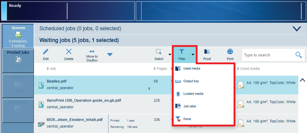 PRISMAsync Print Server offers a search, filter and select function to quickly find and easily select jobs at all available job locations.