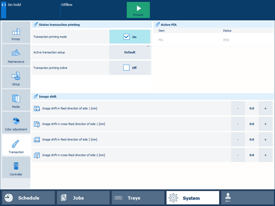Use the [Bring transaction printing online or offline] setting to bring transaction printing online or offline.