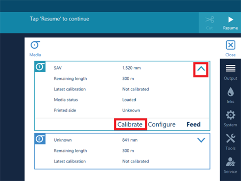 Důležitá je také poloha náběžné hrany média před zahájením kalibrace. Pokud je kalibrace spuštěna z média v zásuvce, kalibrace také optimalizuje náběh (pohyb náběžné hrany přes desku), aby se při tisku zabránilo vzniku bílých nebo černých čar v prvním metru tisku. Tato část se nedělá, když náběžná hrana již prošla koncem desky. Např. kvůli ručnímu podávání.