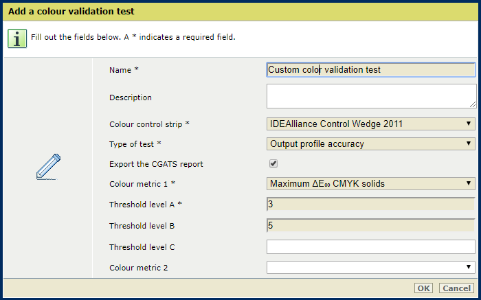 PRISMAcolor Manager에 가져온 확인 검사 결과와 일치하는 테스트 사양이 없는 경우 PRISMAcolor Manager에서 일치하는 테스트 사양을 생성합니다.PRISMAcolor Manager에 해당 참조 값 세트 또는 메트릭 허용 오차 세트가 아직 없는 경우 이 세트도 함께 생성됩니다.