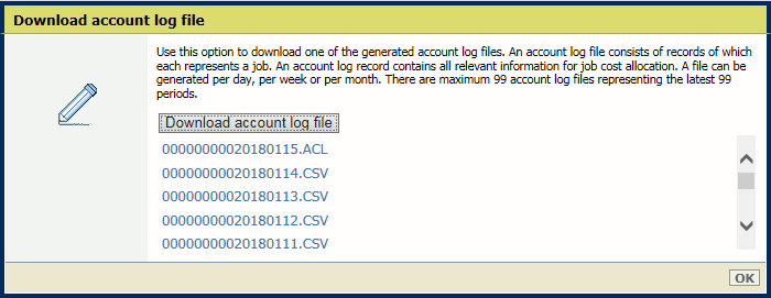 Les fichiers journaux des comptes ont le format de fichier .CSV (délimité par des virgules). Le format .CSV est pris en charge par une grande quantité d'applications professionnelles et est utile pour le transfert des données tabulaires entre programmes. Les fichiers journaux des comptes peuvent être générés par jour, par semaine ou par mois. Les fichiers journaux des comptes terminés ont l'extension .CSV dans le nom. Le fichier journal des comptes en cours - le fichier pouvant encore être rempli de nouveaux travaux - a l'extension .ACL dans le nom.