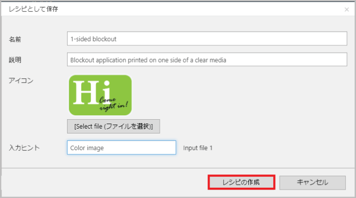 別のウィンドウが開きます。レシピのネームを入力します。レシピの簡単な説明とアイコンを加えてください。入力ファイルのタイプのヒントとを入力することも可能です。新しいレシピを使用して、今後アプリケーションを作成する際に必要となる場合に備えることができます。[レシピの作成] をクリックします。